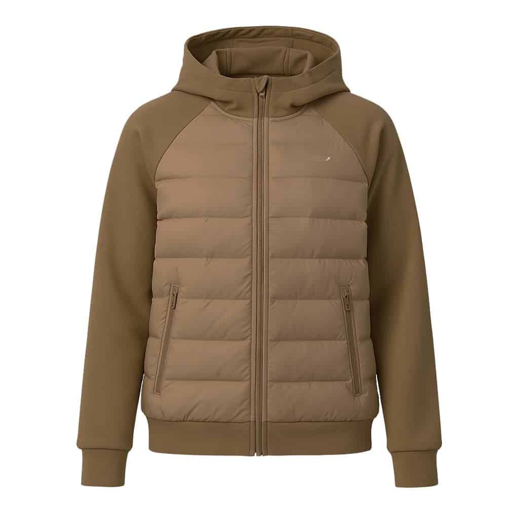 La CHAQUETA Hibrida Pluma Down 650FP | UNISEX | Habano es una prenda revolucionaria en el mercado ecuatoriano, diseñada para quienes buscan calidez sin perder movilidad. Su construcción combina lo mejor de dos mundos: