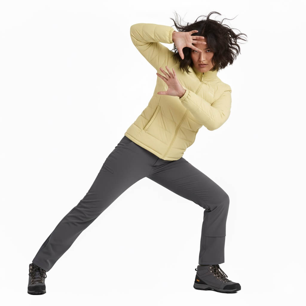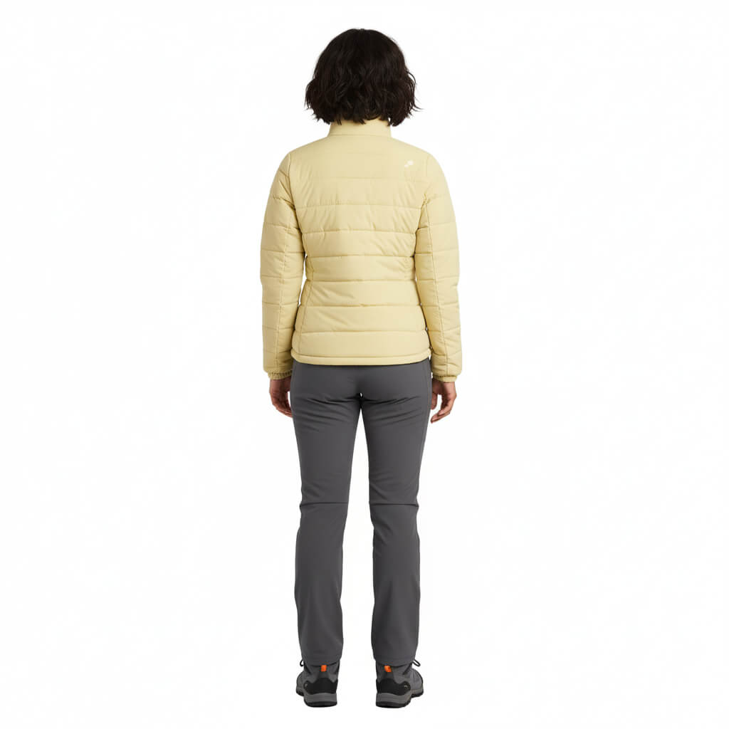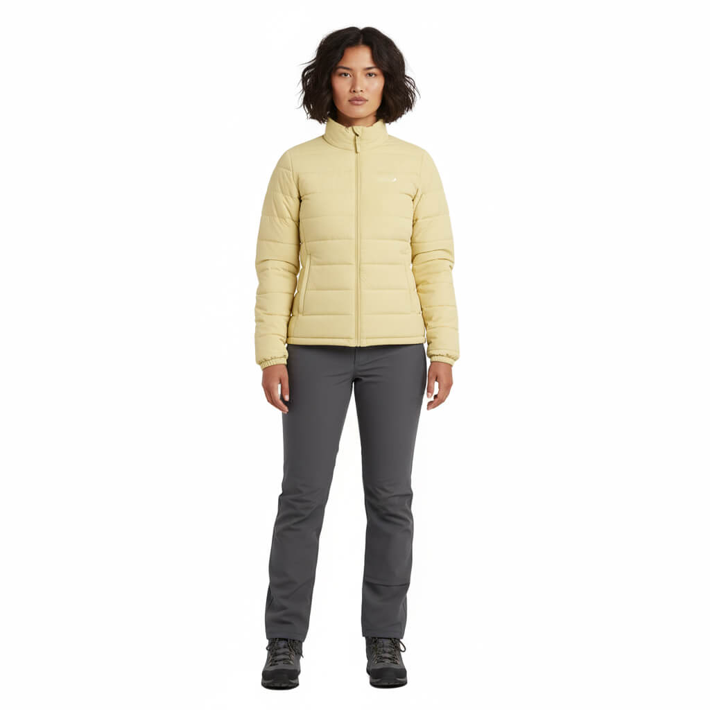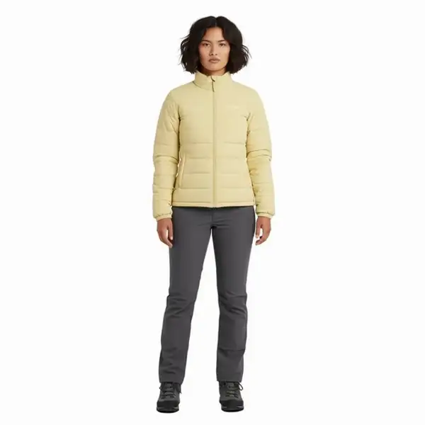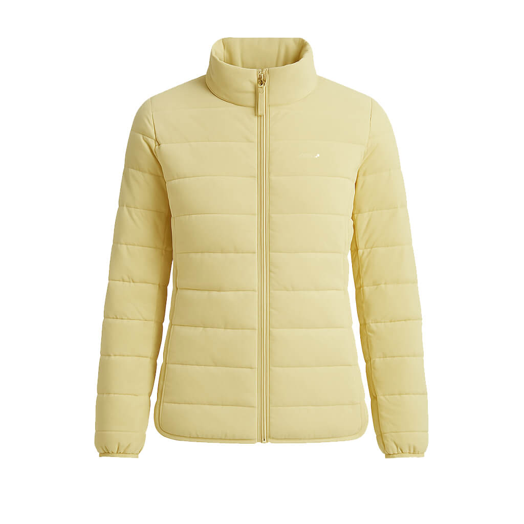 La CHAQUETA Pluma Down 650FP Ultimate | SHE | Amarillo es el equilibrio perfecto entre tecnología de montaña y estilo urbano premium. Diseñada para mujeres que buscan una prenda sofisticada, femenina, resistente y versátil, combina un relleno de 650 Filling Power con un tejido exterior de textura PEACH (melocotón) que ofrece una suavidad aterciopelada al tacto y un acabado superior.