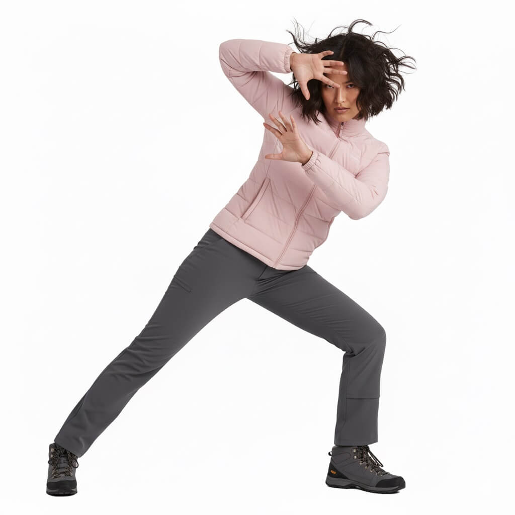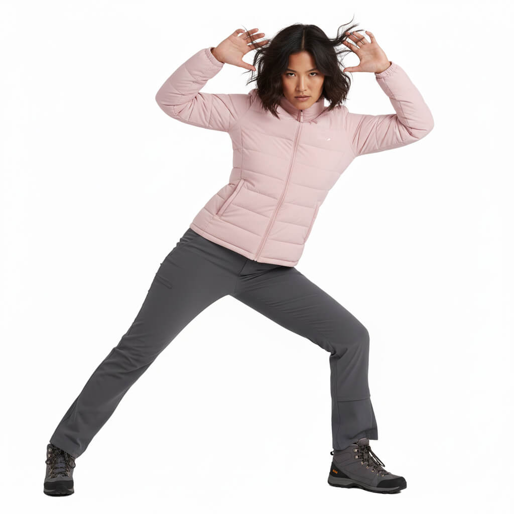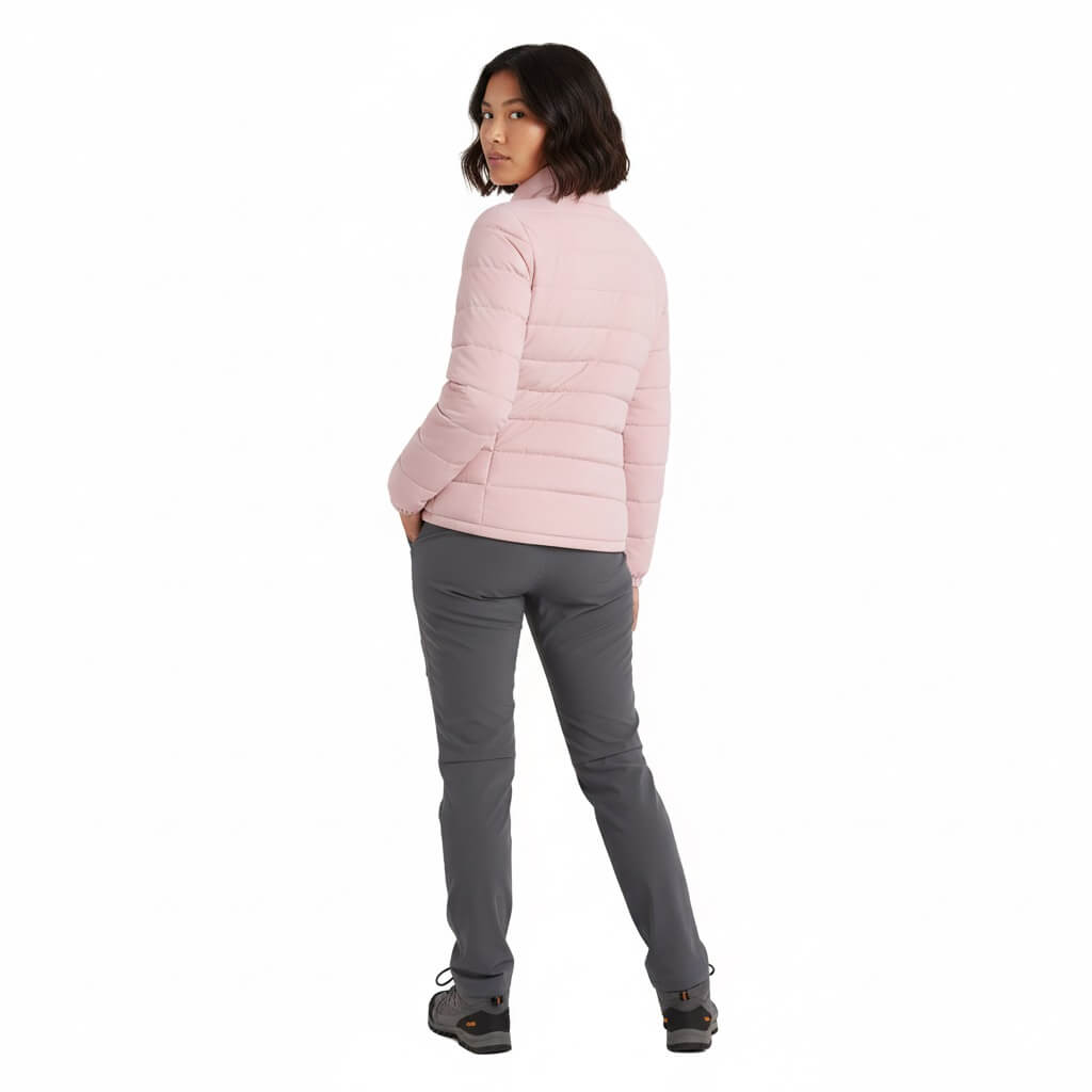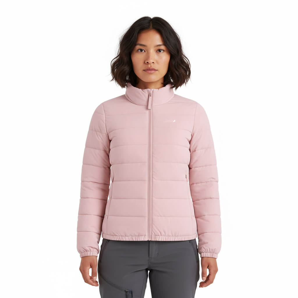La CHAQUETA Pluma Down 650FP Ultimate | SHE | Rosa es el equilibrio perfecto entre tecnología de montaña y estilo urbano premium. Diseñada para mujeres que buscan una prenda sofisticada, femenina, resistente y versátil, combina un relleno de 650 Filling Power con un tejido exterior de textura PEACH (melocotón) que ofrece una suavidad aterciopelada al tacto y un acabado superior.