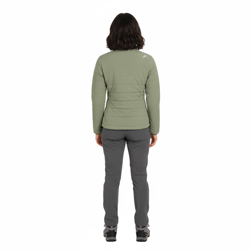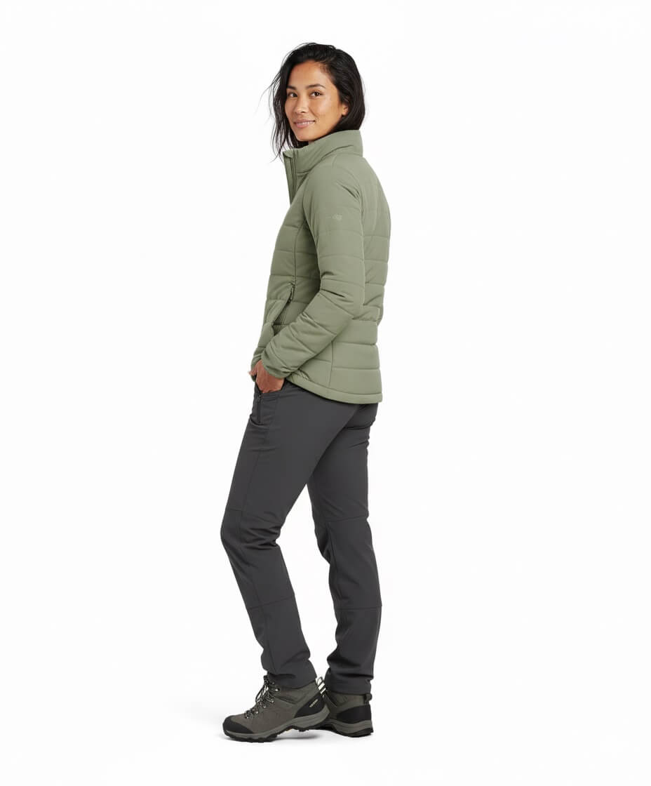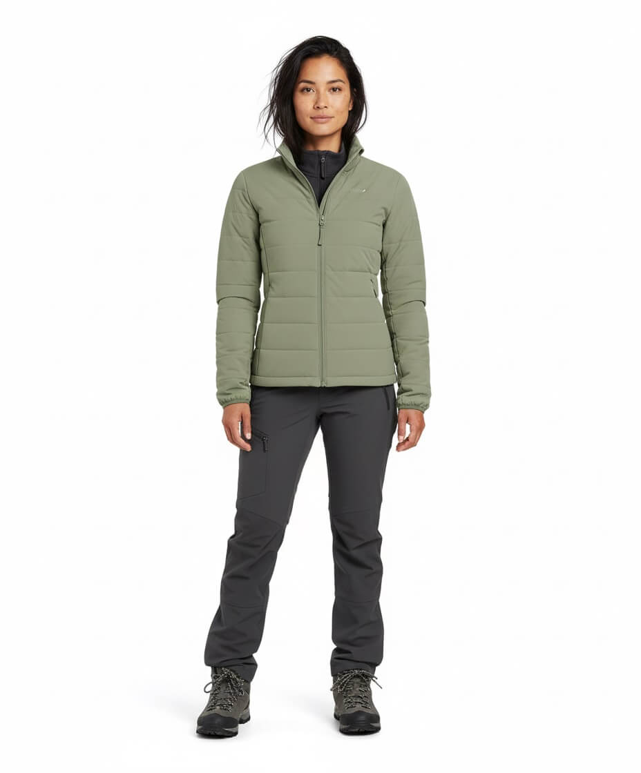 La CHAQUETA Pluma Down 650FP Ultimate | SHE | Verde es el equilibrio perfecto entre tecnología de montaña y estilo urbano premium. Diseñada para mujeres que buscan una prenda sofisticada, femenina, resistente y versátil, combina un relleno de 650 Filling Power con un tejido exterior de textura PEACH (melocotón) que ofrece una suavidad aterciopelada al tacto y un acabado superior.