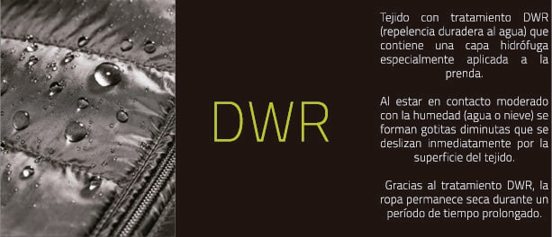 80% impermeable gracias a su tejido con tratamiento DWR (Durable Water Repellent).
