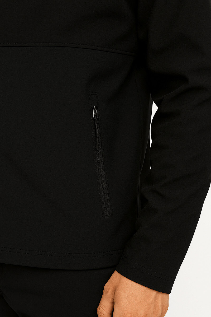 - Tejido softshell elástico de 3 capas, con una cara exterior lisa y resistente al viento, una membrana intermedia transpirable y una cara interior suave tipo microforro.